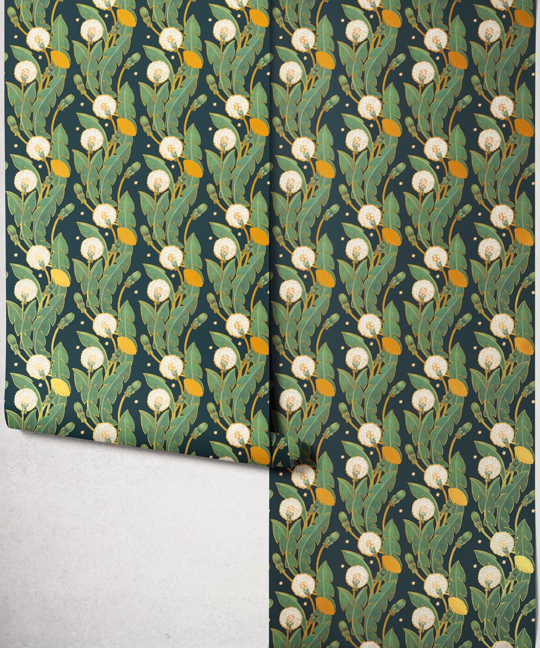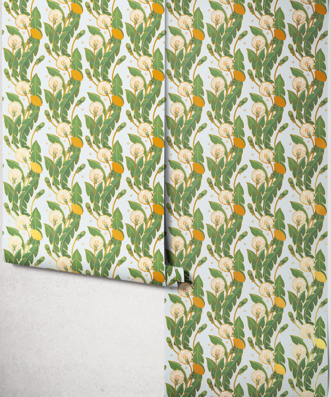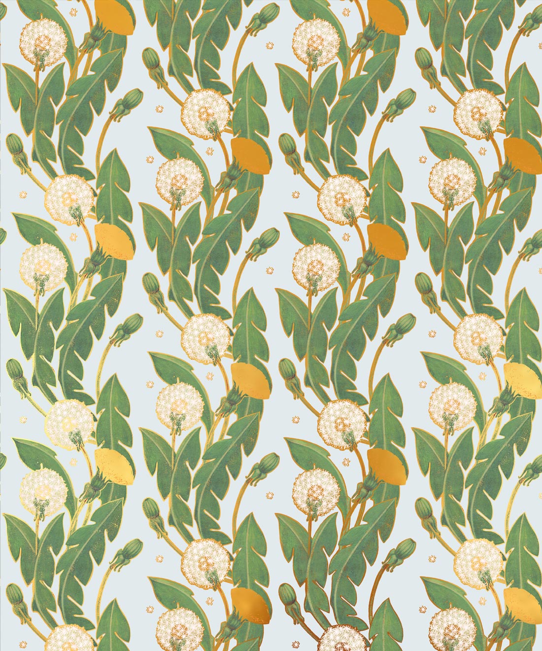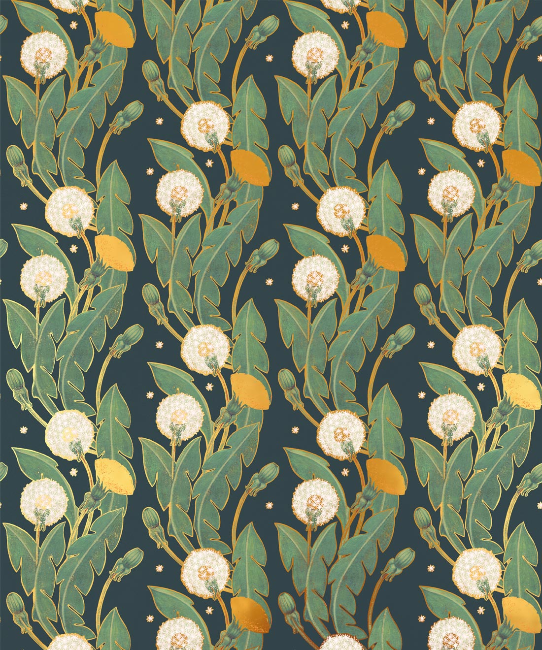 A wallpaper design featuring a flowing trail of dandelions with vigorous curves of scrolling foliage. Rosettes of leaves, bright flowers and delicate seed heads create a richly detailed botanical composition. Gold metallic accents enhance the intricate detailing, adding an opulent finish well suited to classic interiors.