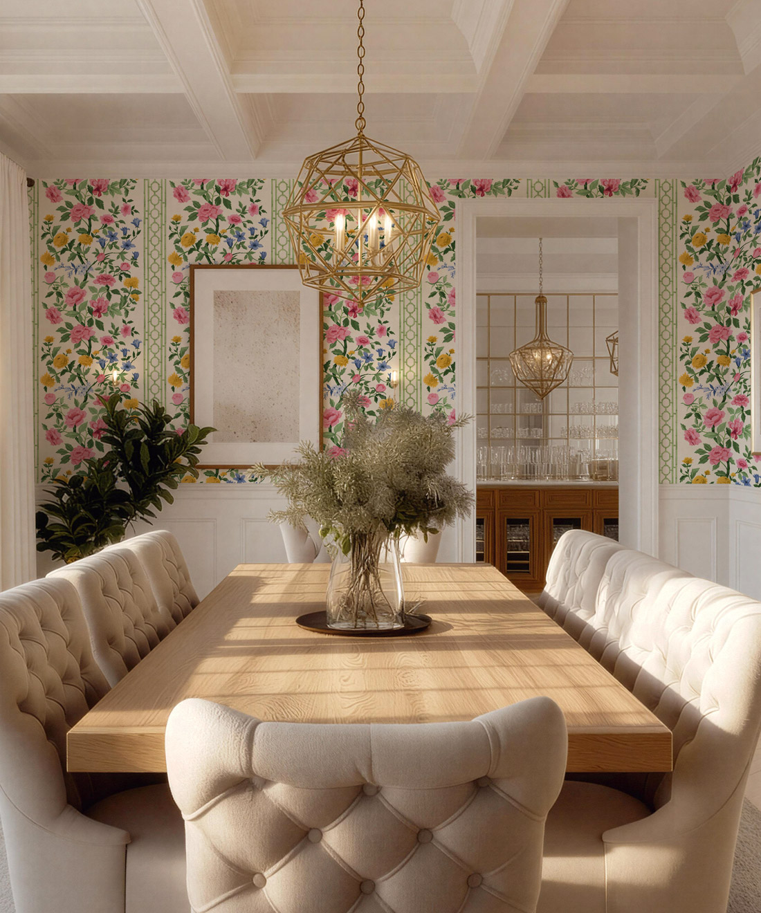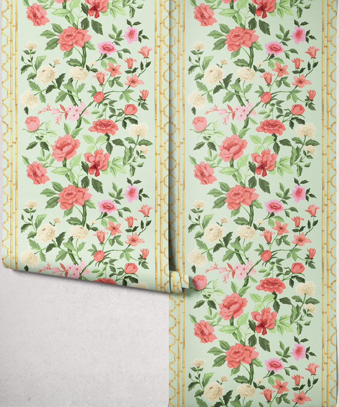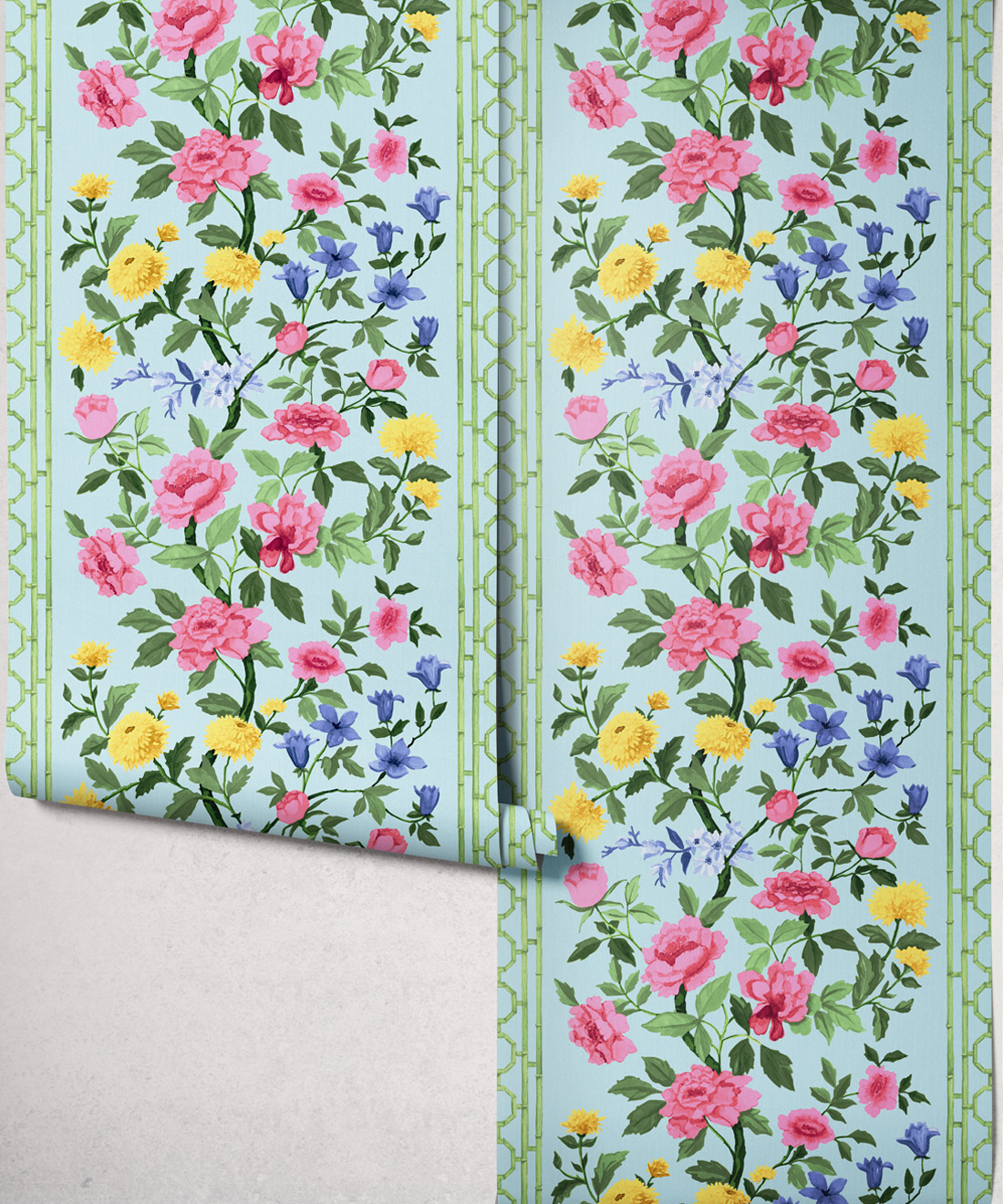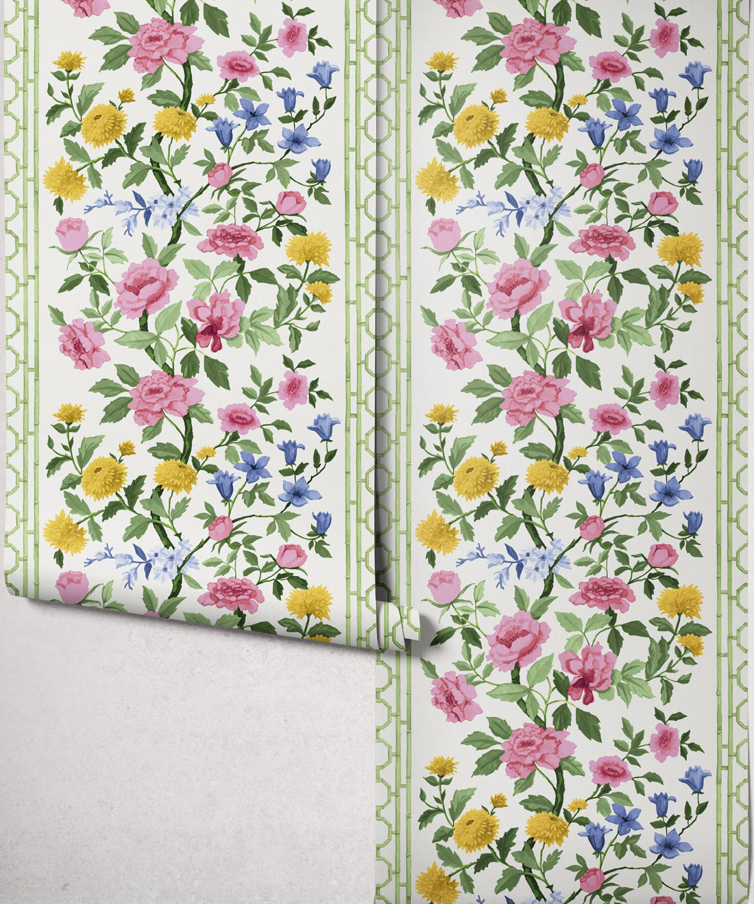 Edith is a fresh interpretation of the classic floral, featuring hand-painted blooms and bamboo detailing that give it both structure and lightness. Its soft rhythm and tonal depth bring harmony to bedrooms, dining rooms and sun-filled living spaces.