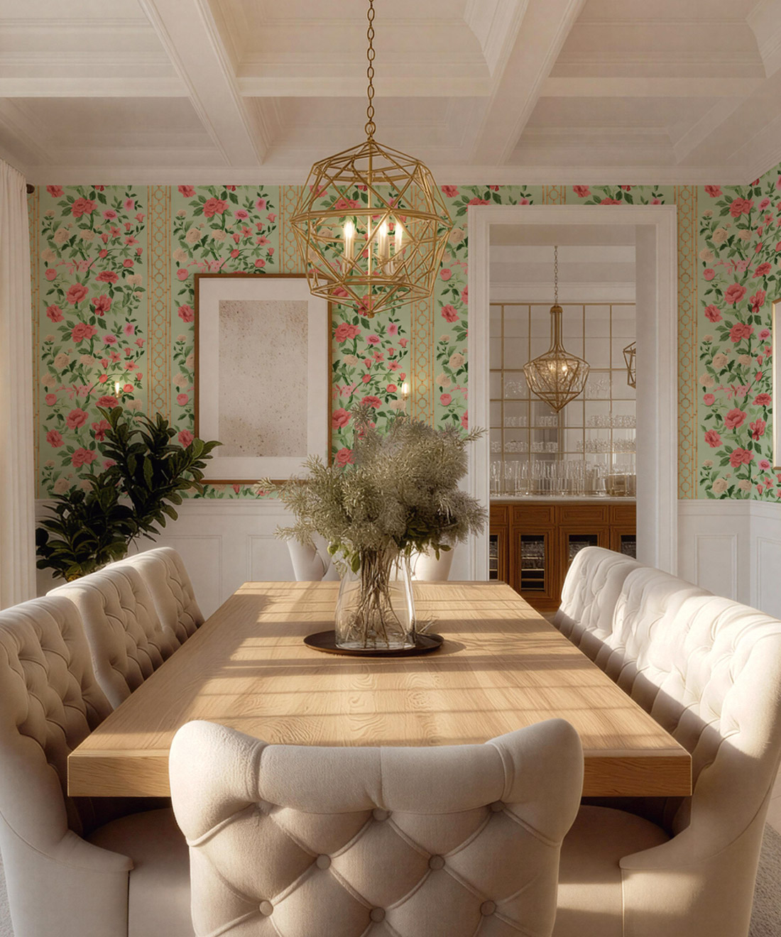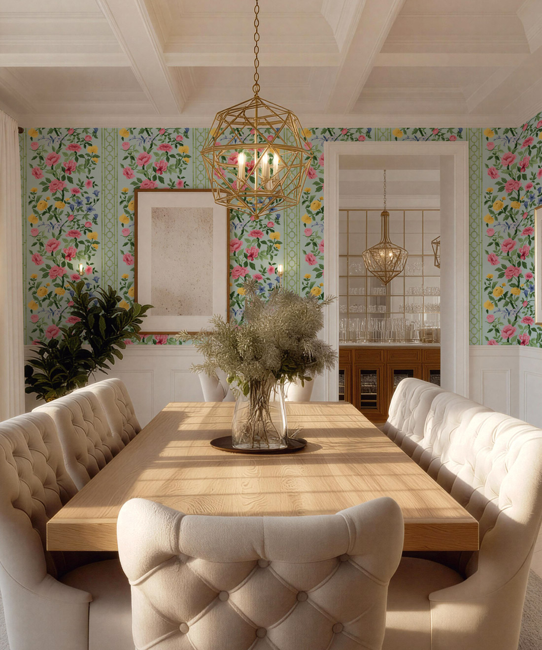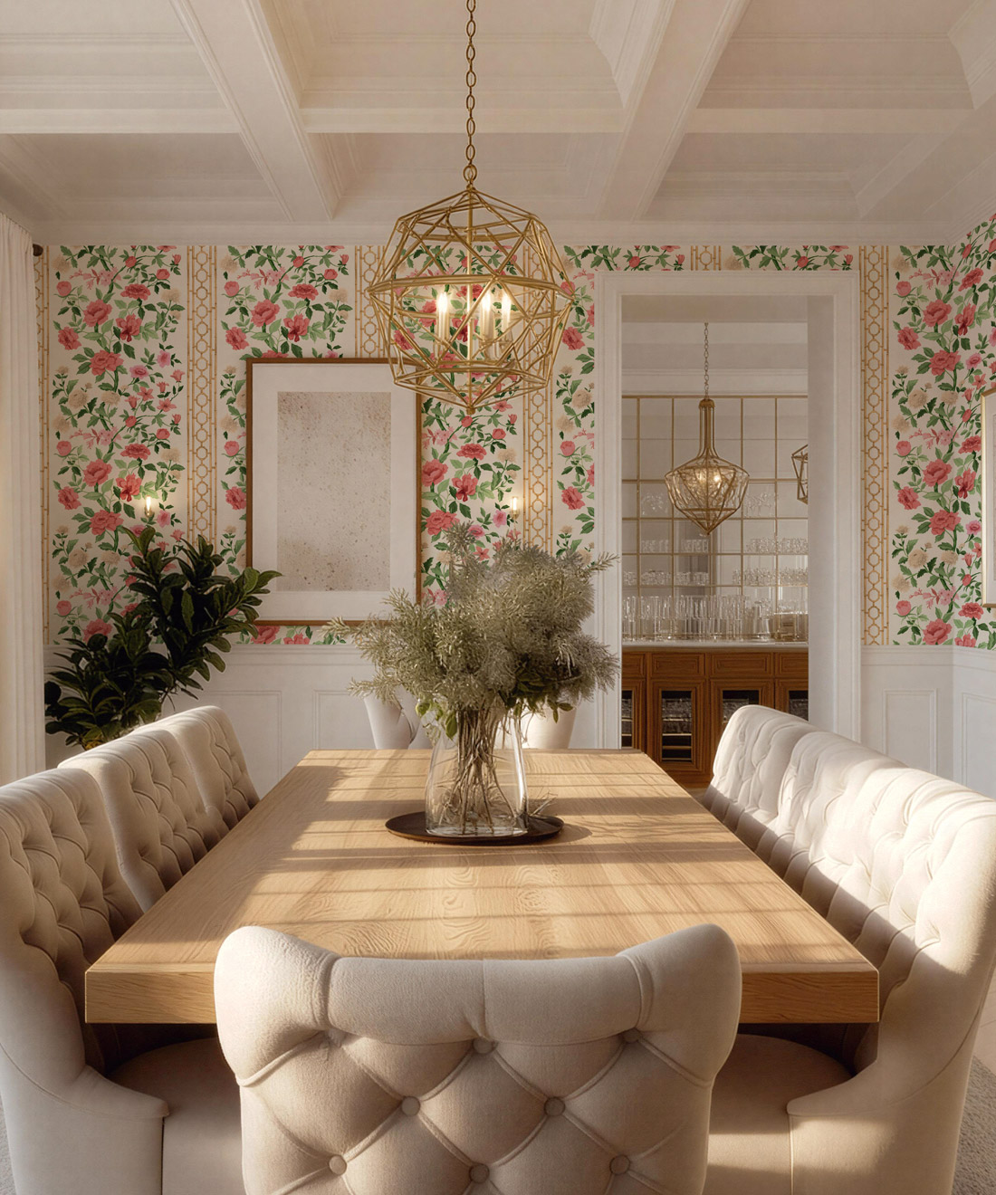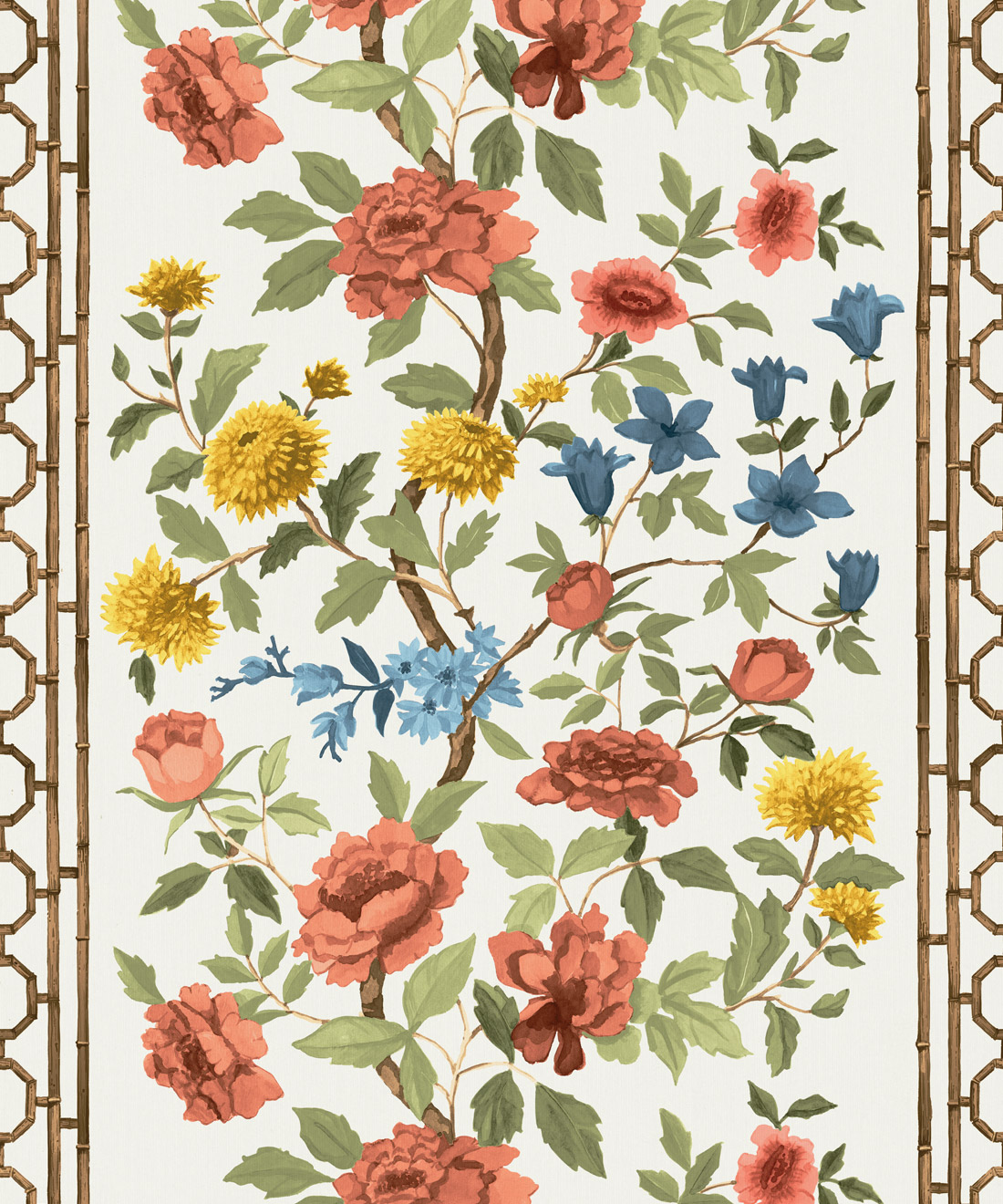 Edith is a fresh interpretation of the classic floral, featuring hand-painted blooms and bamboo detailing that give it both structure and lightness. Its soft rhythm and tonal depth bring harmony to bedrooms, dining rooms and sun-filled living spaces.