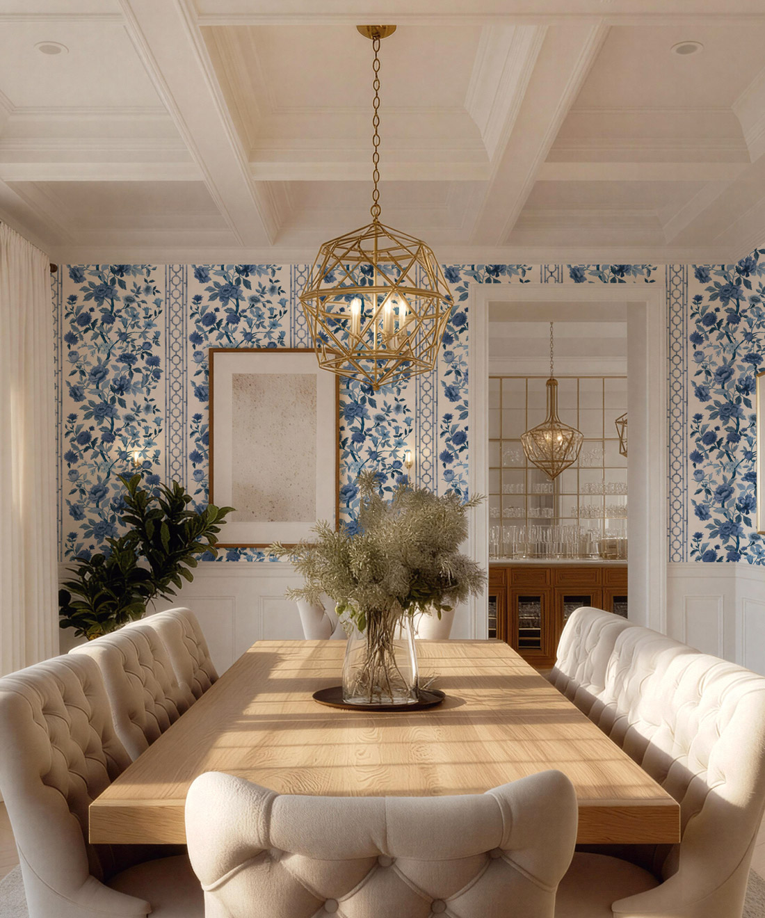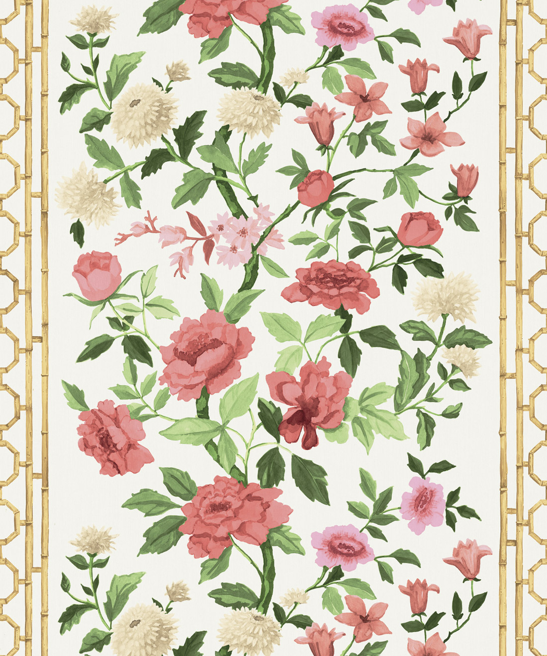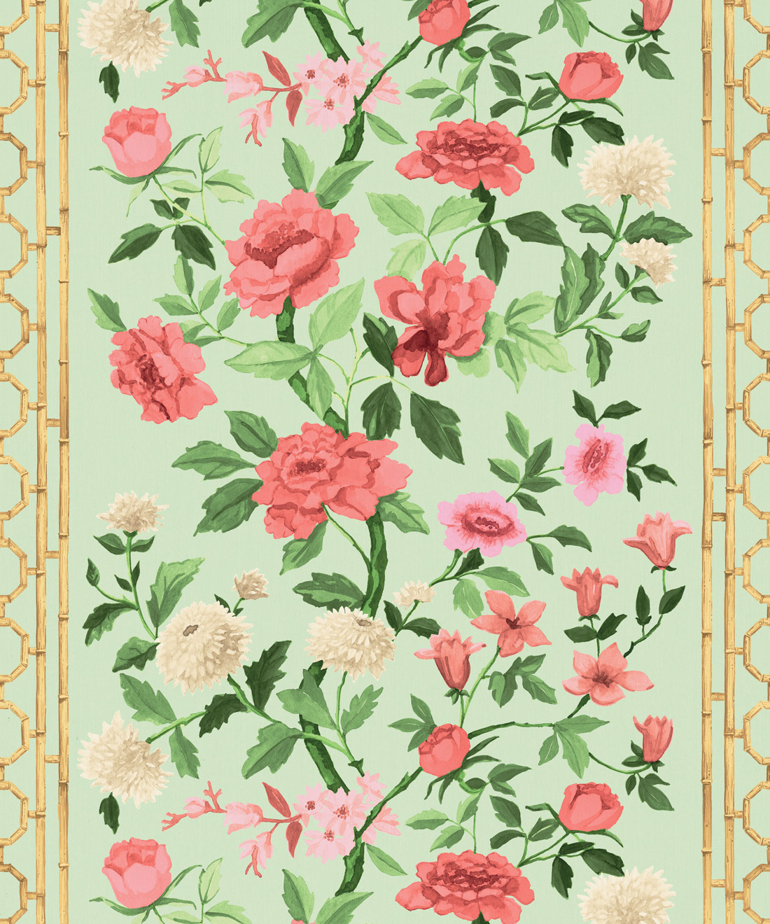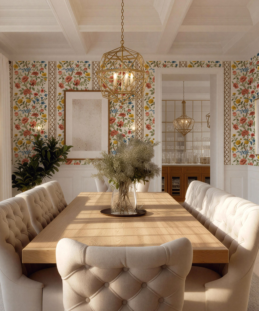 Edith is a fresh interpretation of the classic floral, featuring hand-painted blooms and bamboo detailing that give it both structure and lightness. Its soft rhythm and tonal depth bring harmony to bedrooms, dining rooms and sun-filled living spaces.
