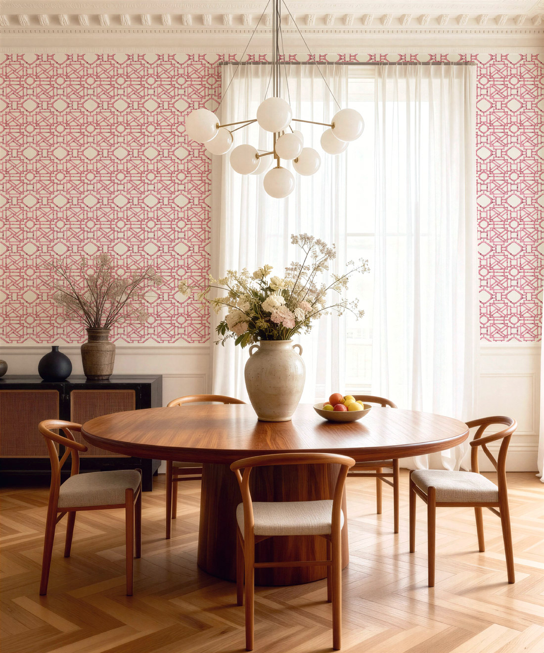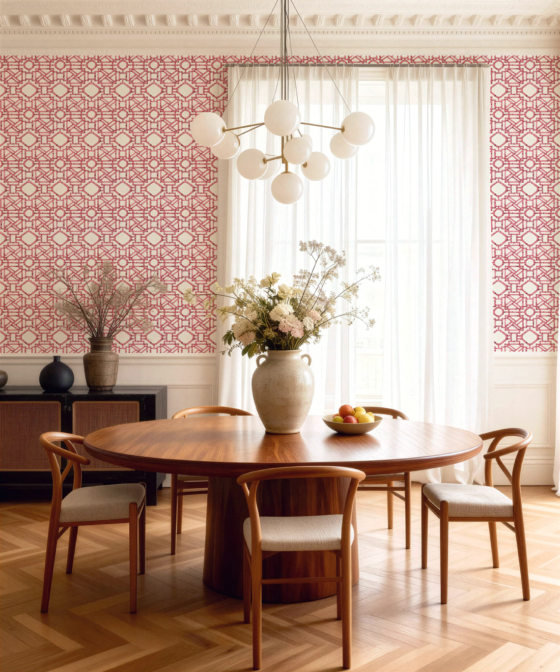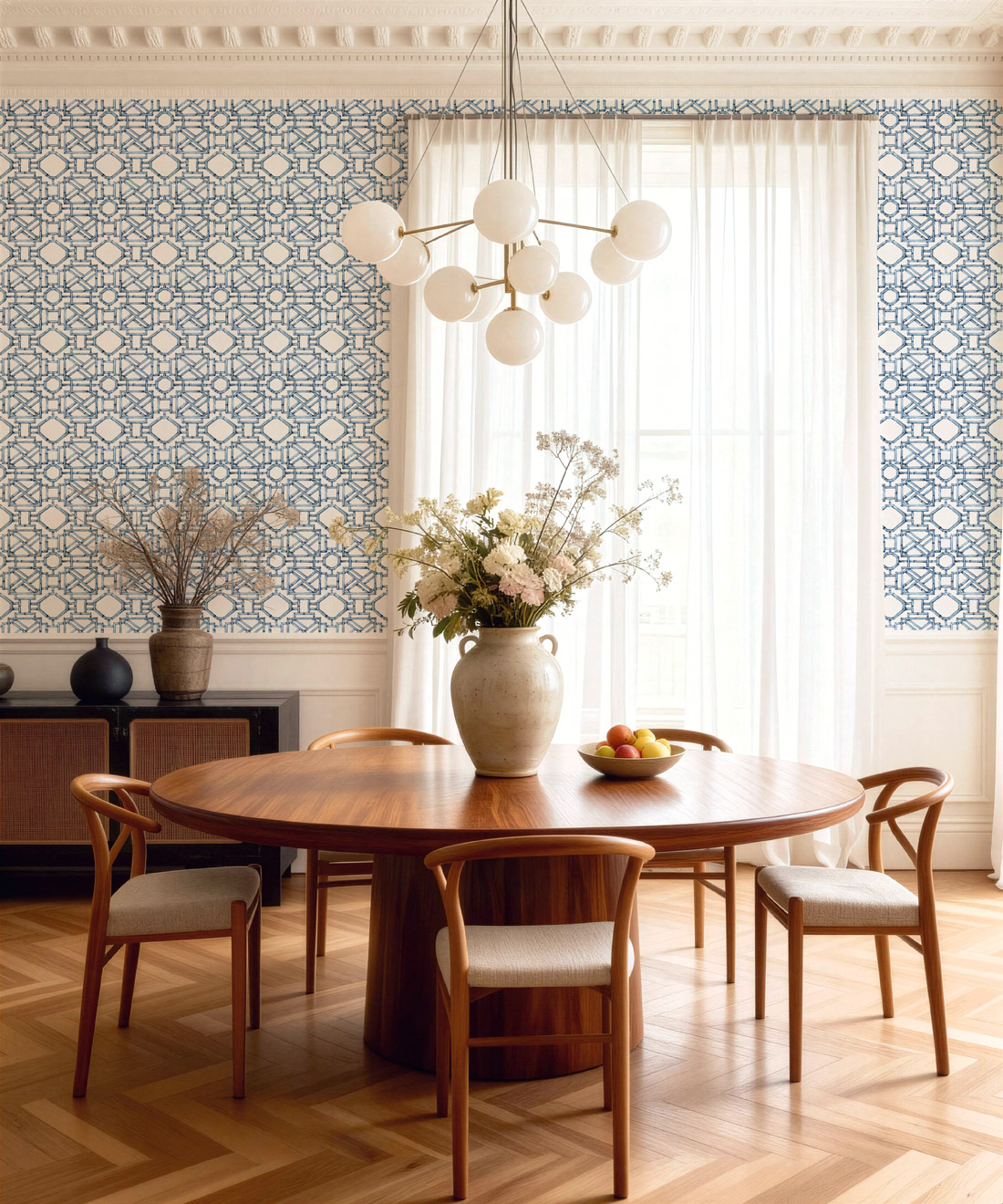 Mustique reimagines the bamboo trellis through the lens of timeless Chinoiserie. Hand-painted, this design balances symmetry and organic movement, creating a versatile pattern that feels worldly yet relaxed. It brings a subtle sense of luxury to spaces where sophistication meets ease including entryways, sunrooms, bedrooms, powder rooms, bathrooms or dining rooms.
