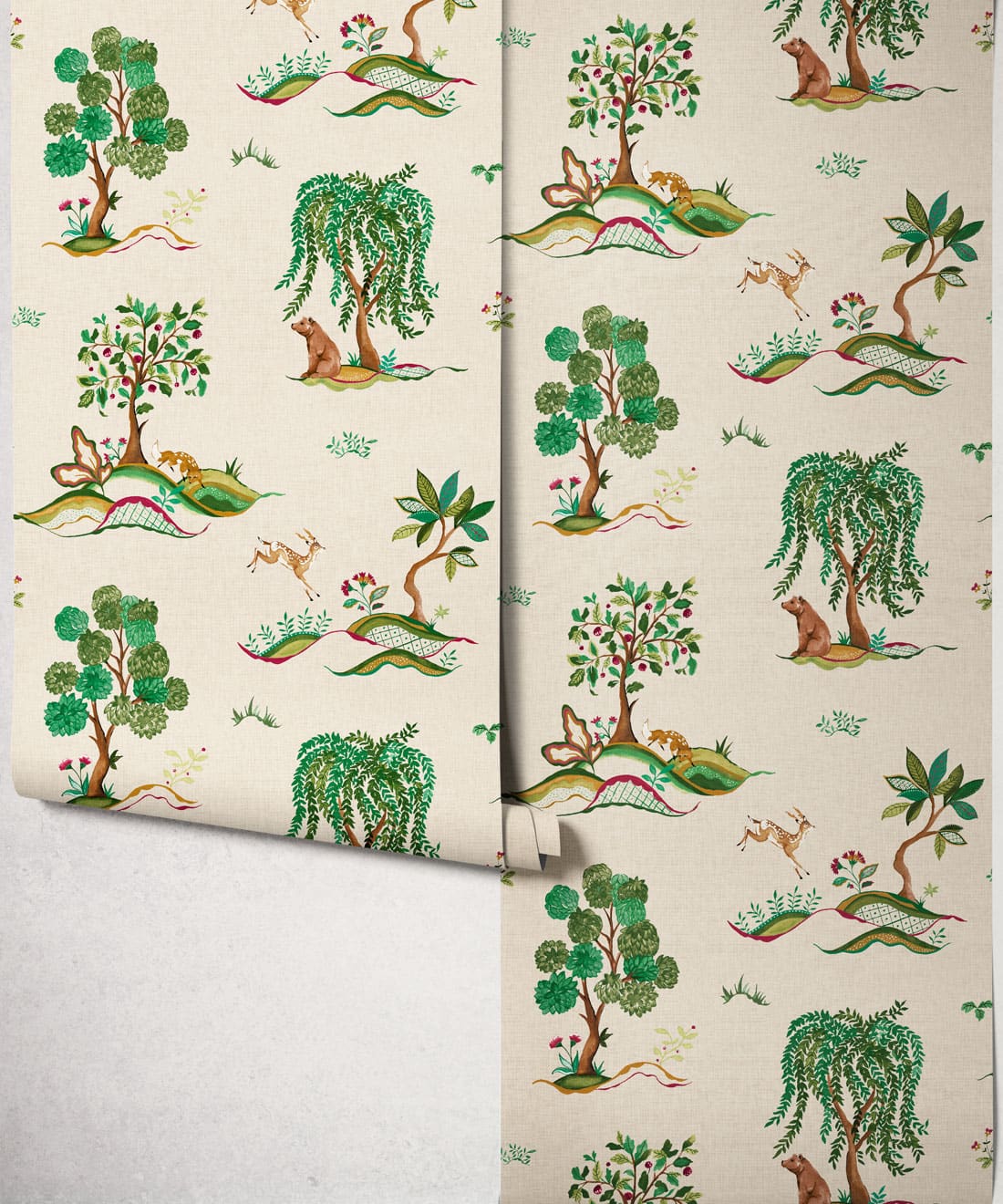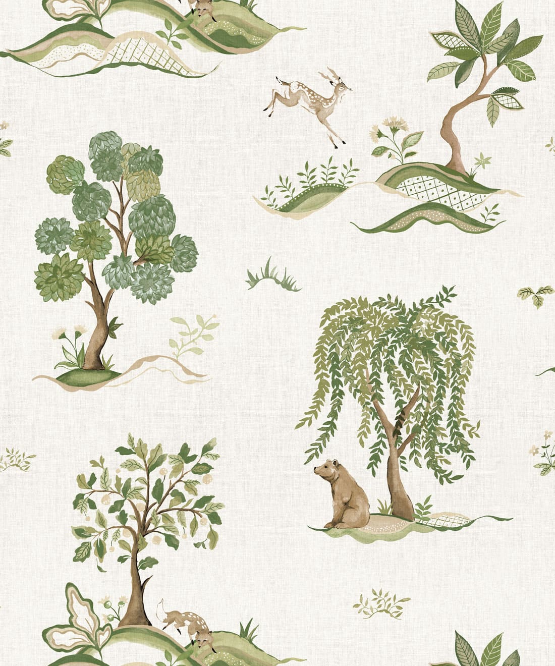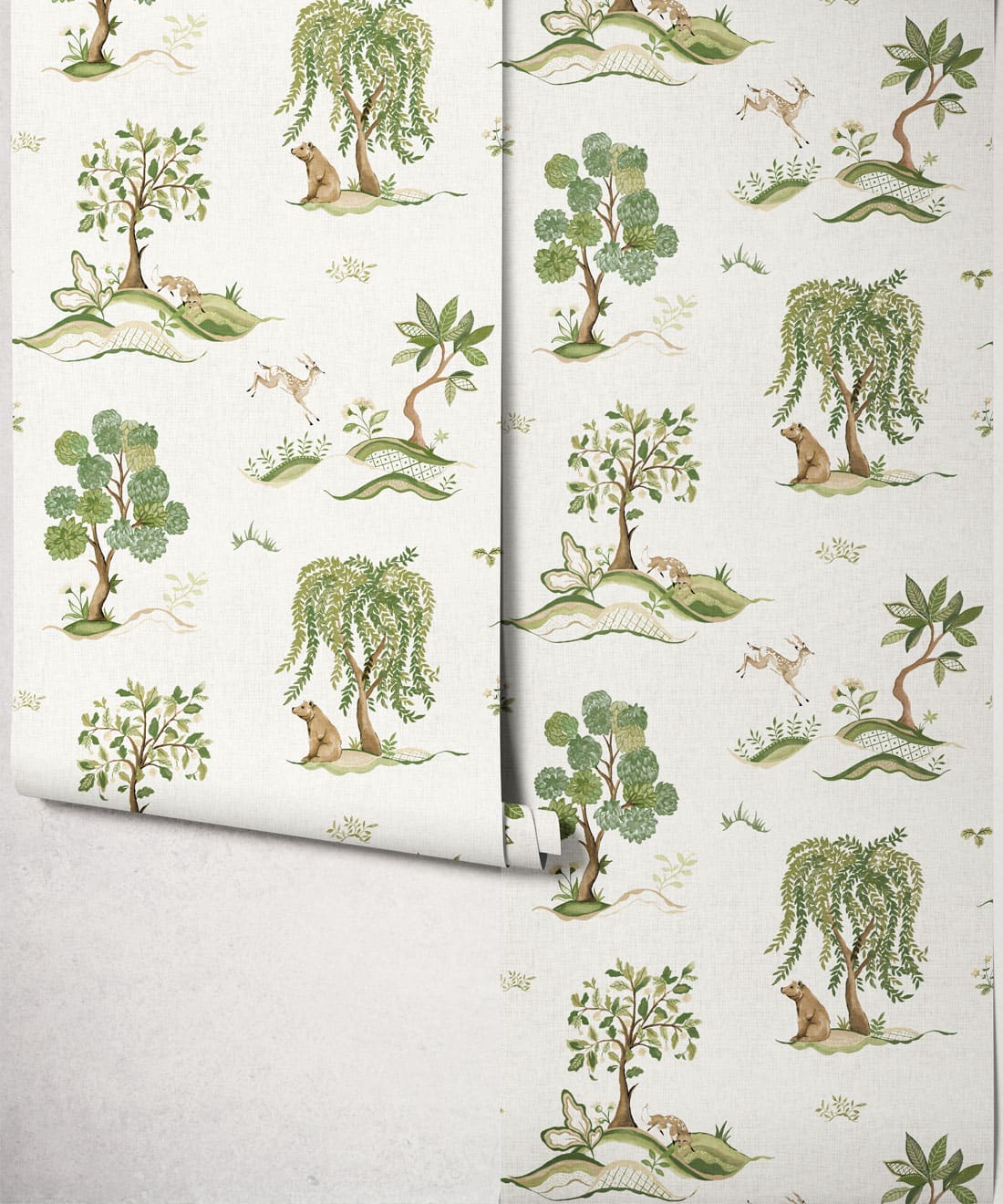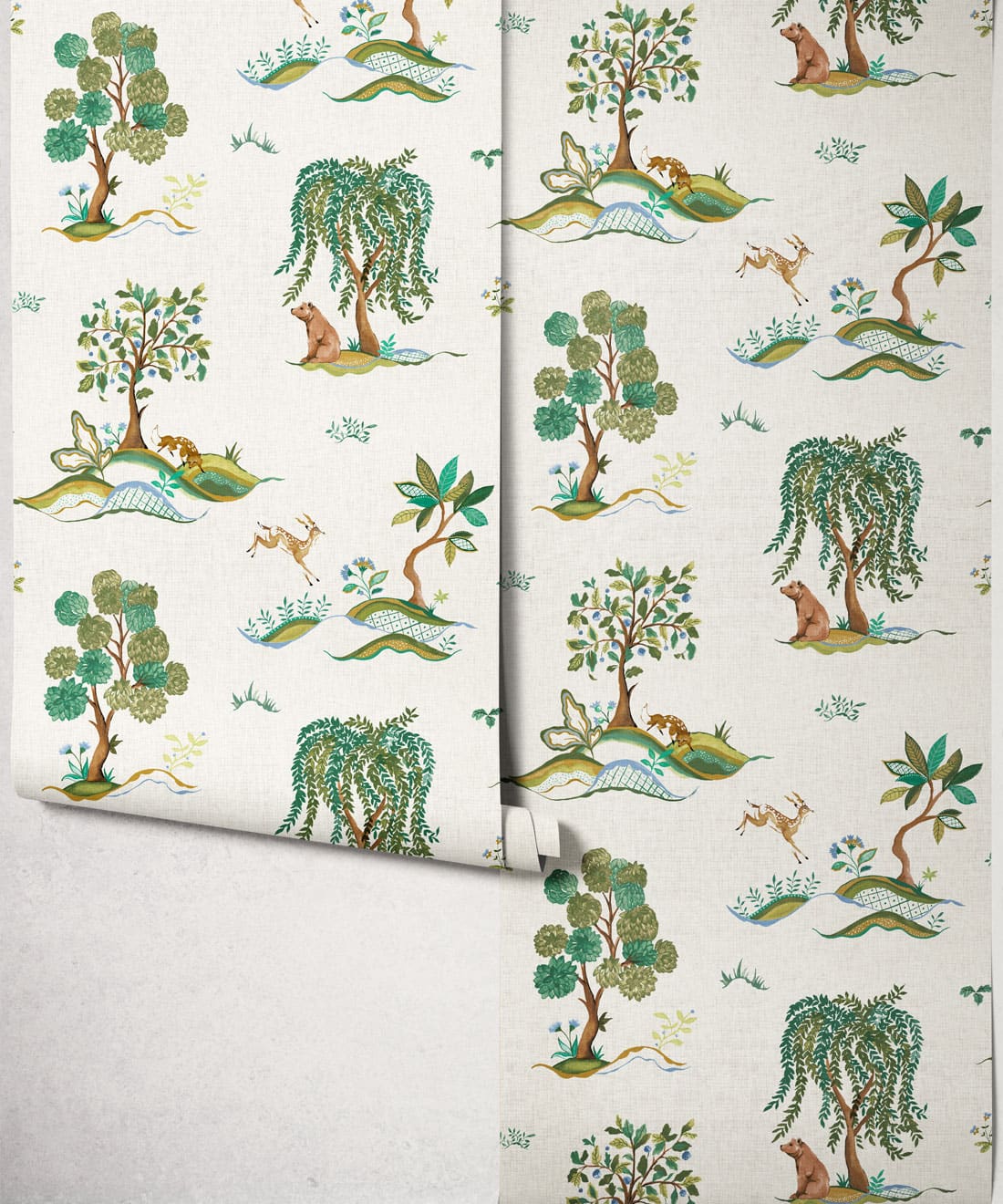 Willow Wood is a toile inspired woodland wallpaper influenced by the intricate storytelling of 17th century Jacobean embroidery. Hand painted trees, winding foliage and woodland details unfold across the design, creating an illustrative pattern with a gentle storybook character.