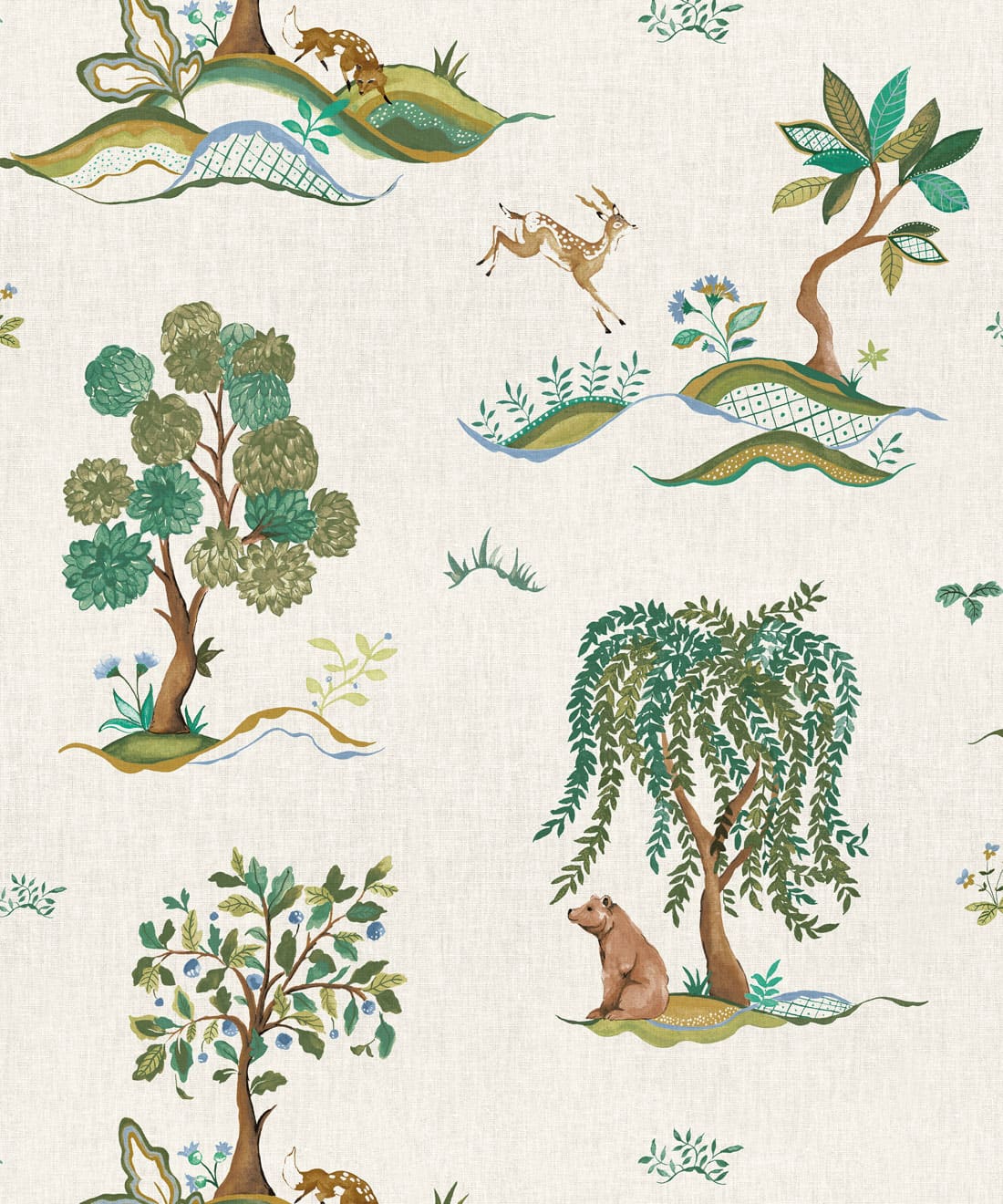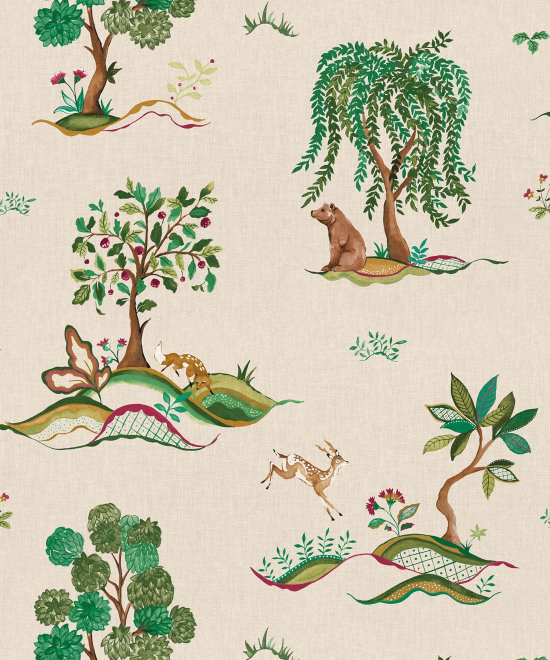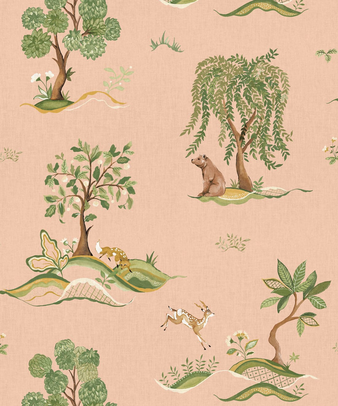 Willow Wood is a toile inspired woodland wallpaper influenced by the intricate storytelling of 17th century Jacobean embroidery. Hand painted trees, winding foliage and woodland details unfold across the design, creating an illustrative pattern with a gentle storybook character.