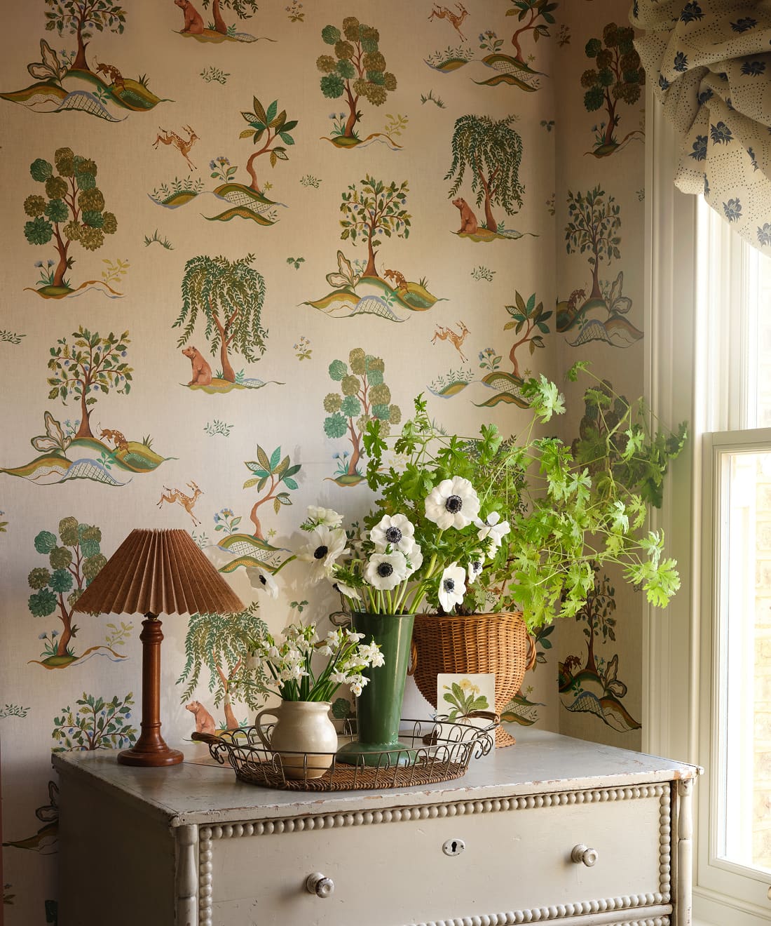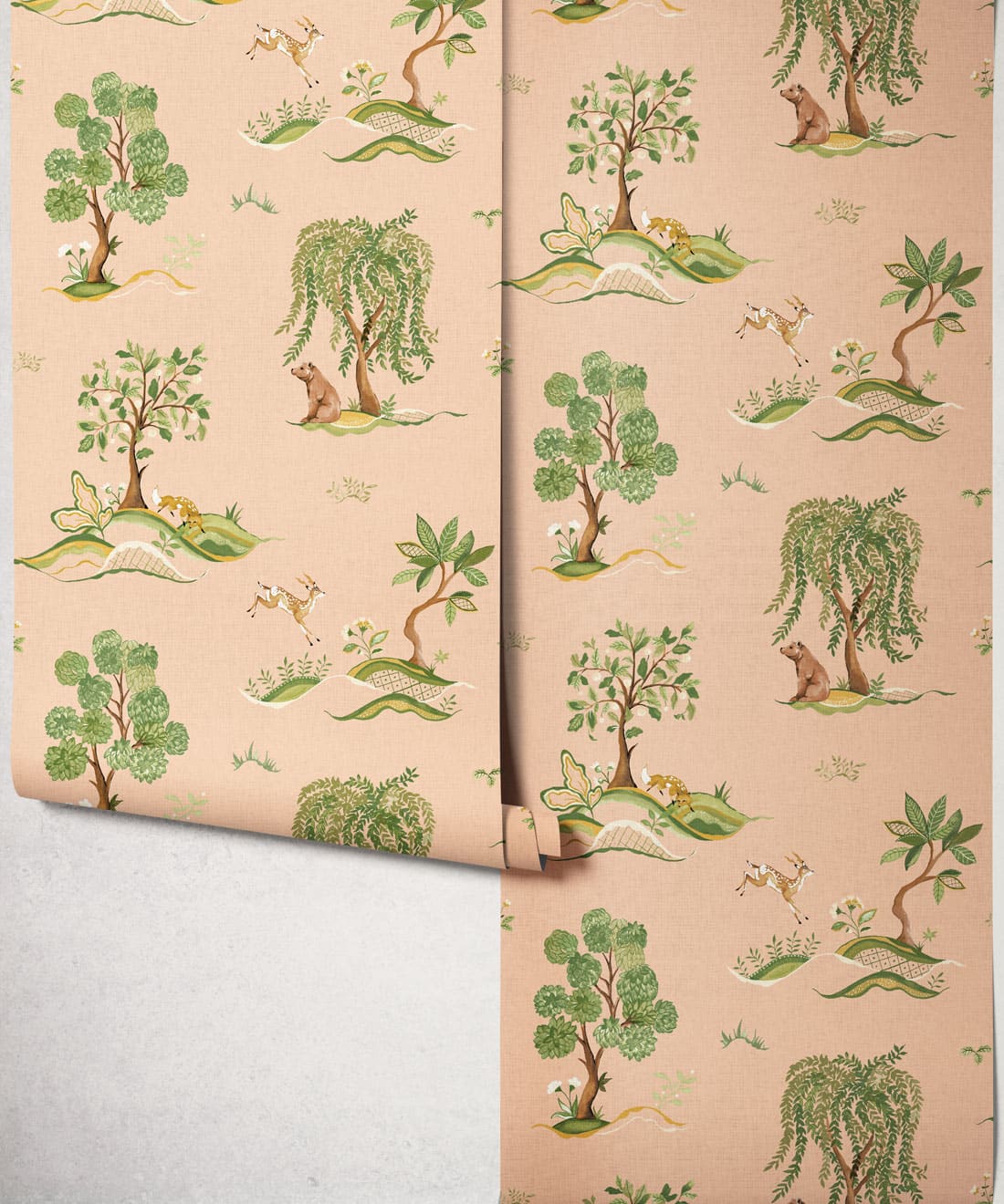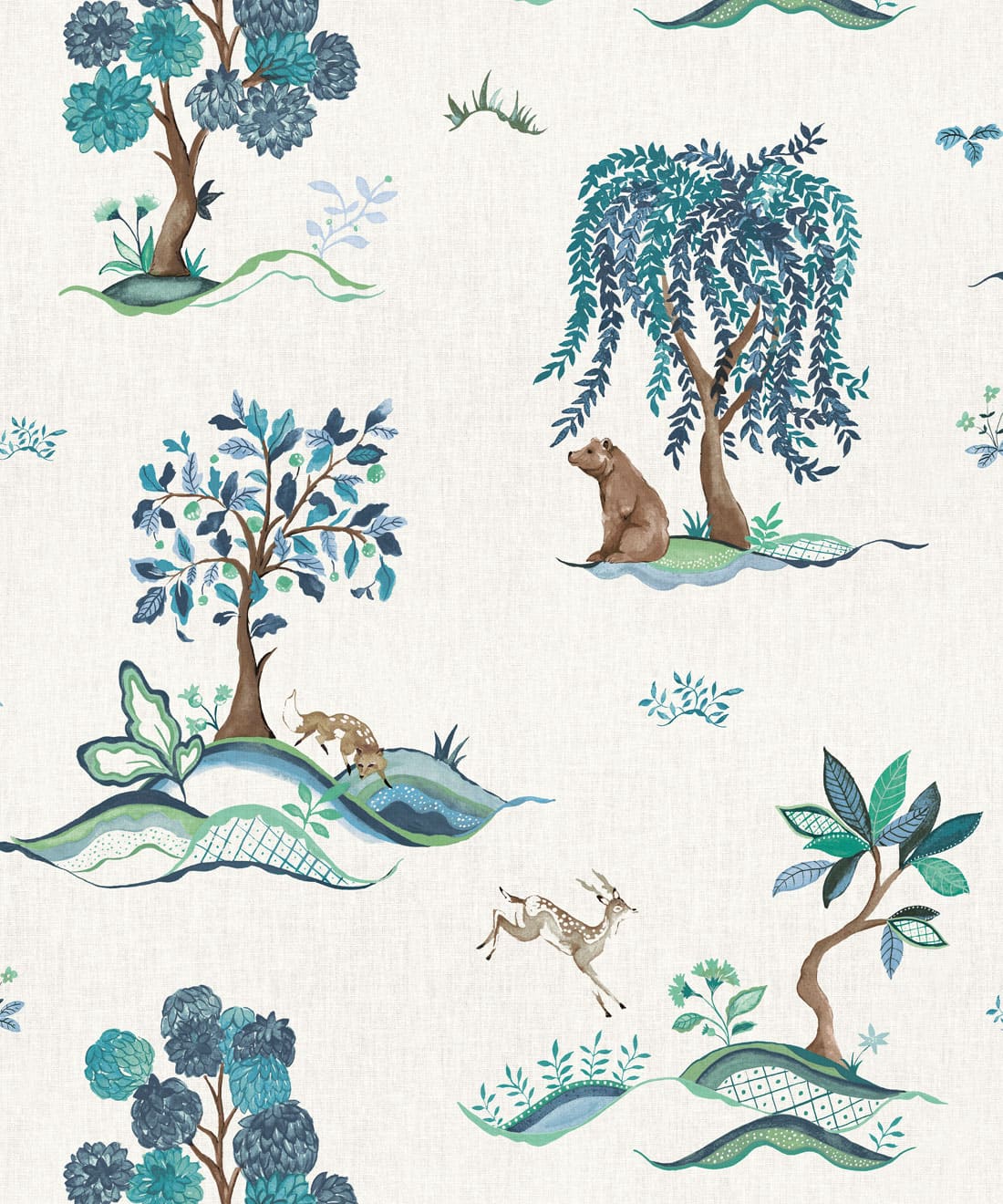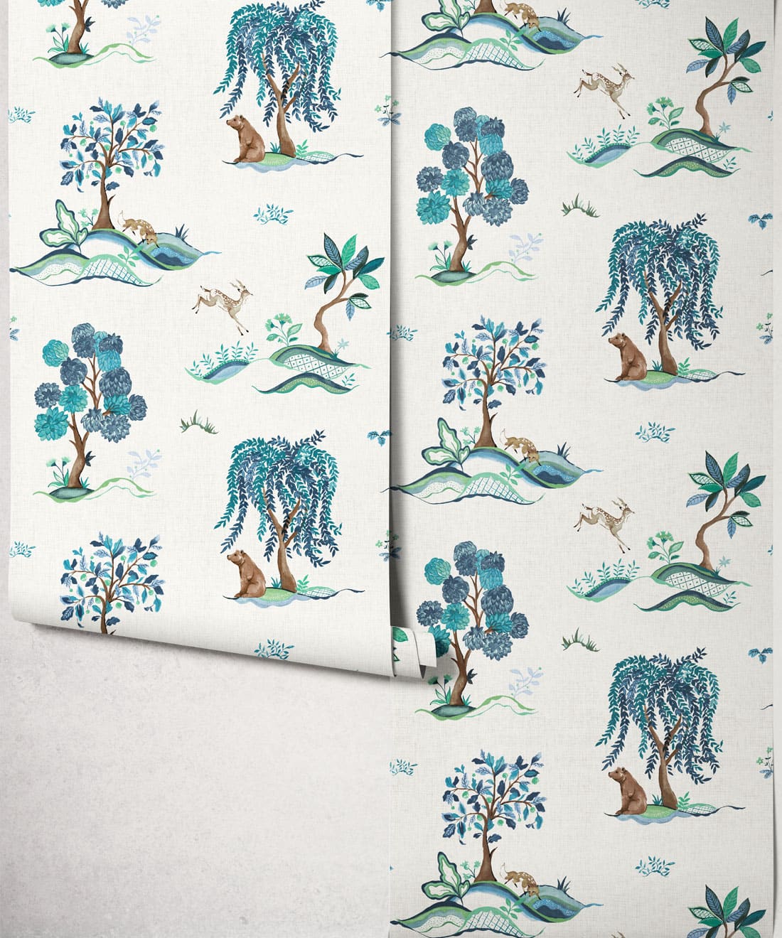 Willow Wood is a toile inspired woodland wallpaper influenced by the intricate storytelling of 17th century Jacobean embroidery. Hand painted trees, winding foliage and woodland details unfold across the design, creating an illustrative pattern with a gentle storybook character.